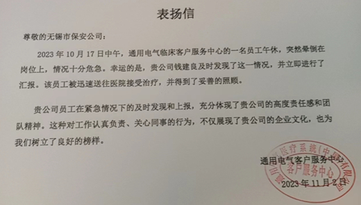 近日,公司收到一封表揚(yáng)信,感謝派駐通用電氣保安員錢建良第一時間發(fā)現(xiàn)暈倒的企業(yè)員工并上報,使員工得到及時的醫(yī)療救治。這封表揚(yáng)信是對公司保安員在工作崗位上所展現(xiàn)出的優(yōu)秀品質(zhì)和職業(yè)素養(yǎng)的認(rèn)可和鼓勵,更彰顯了保安員的專業(yè)能力,體現(xiàn)了公司以人為本的企業(yè)文化。