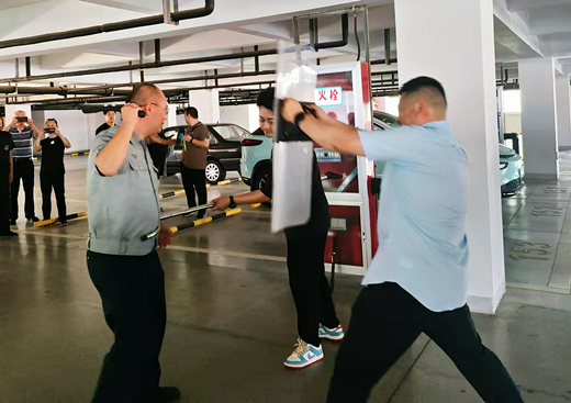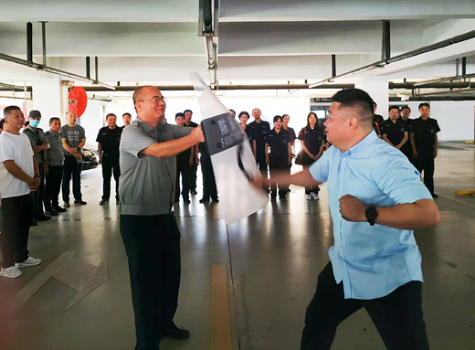 培訓中,公司培訓講師帶領參訓隊員學習了金融系統保安人員的儀容儀表、行為規范、文明用語、工作規范,以及消防器械使用方法和突發事件應急處理等。強調了銀行營業大堂和辦公區域的安全職責,并詳細說明了各處的安保要求,要求隊員注意服務規范、禮節禮貌及儀容儀表,通過巡查、警戒和值守等工作,保障客戶和員工的安全。通過深入淺出的講解,使參訓人員增強了服務意識、防范意識,切實提升保安員整體素質。隨后,講師現場演練教學,演示了橡膠警棍、防暴盾牌、防暴鋼叉等防暴器械的正確操作與使用,以及防暴處置的注意事項和應對方式。