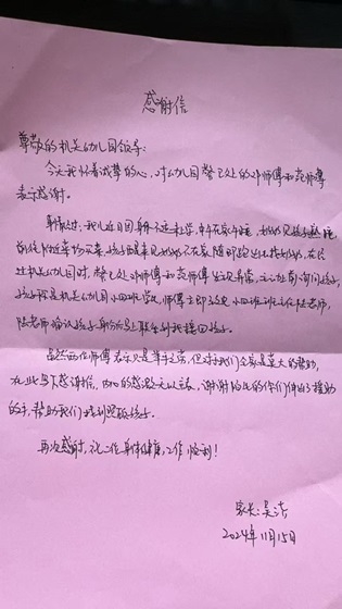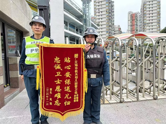 近日,我公司派駐機關幼兒園的保安員鄧文忠和范仁琪收到一面錦旗,錦旗內容為:“貼心安保送兒歸,忠誠衛士恩難忘”,隨著錦旗一起送來的,還有一封情真意切的感謝信,感謝兩位保安員第一時間發現孩子異常并主動上前詢問具體情況,確認孩子身份后隨即聯系老師并致電家長接回孩子。在接過這份“榮譽”后,兩位保安員紛紛表示收到錦旗是對我們工作給予的認可,讓我們更有一種責任感和使命感要把這份工作做得更好,好讓孩子們的家長更放心。