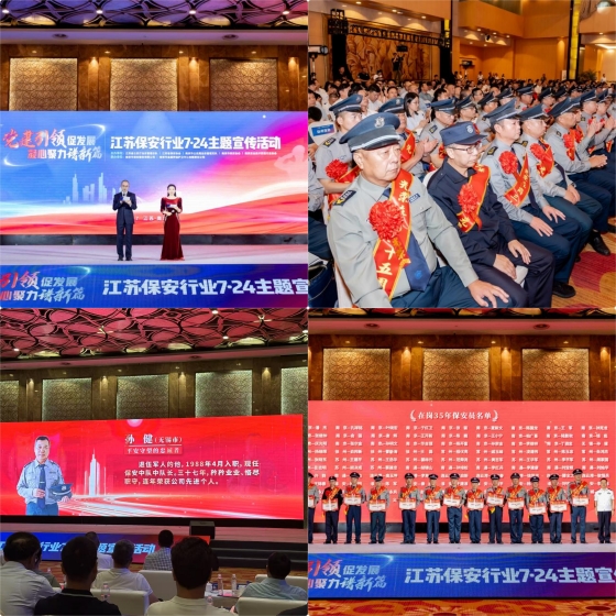 1. 參加江蘇保安行業7·24主題宣傳活動。7月24日,公司領導帶隊赴寧參加江蘇保安行業7·24主題宣傳活動。此次活動是江蘇保安行業內一次重要的交流盛會,公司保安中隊長孫健同志作為“全省連續從業35年以上在職保安員”優秀典范上臺接受表彰。這一榮譽不僅是對孫健同志長期堅守崗位、敬業奉獻的高度認可,更是對公司多年來在保安隊伍建設與人才培養方面成績的肯定。活動中,參會人員深入參觀了“智能安保巡檢機器人”,見證了“安新一號”的首發,通過近距離觀摩和了解行業最新智慧安防技術與數字化應用成果,深刻感受到科技賦能安保行業的巨大潛力和未來發展方向,對智慧安防及數字化轉型升級有了全新的認識和更深的理解。